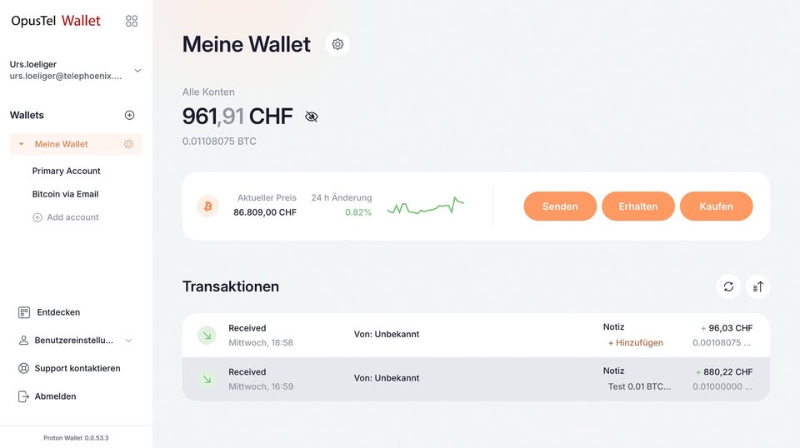 Der Einzahler vom 1.11. 2024 zahlt CHF 1’000 ein und wir legen CHF 500 davon in Bitcoin an. Ihr Saldo zeigt erstmals CHF 1’000 an und ist auch so verfügbar.